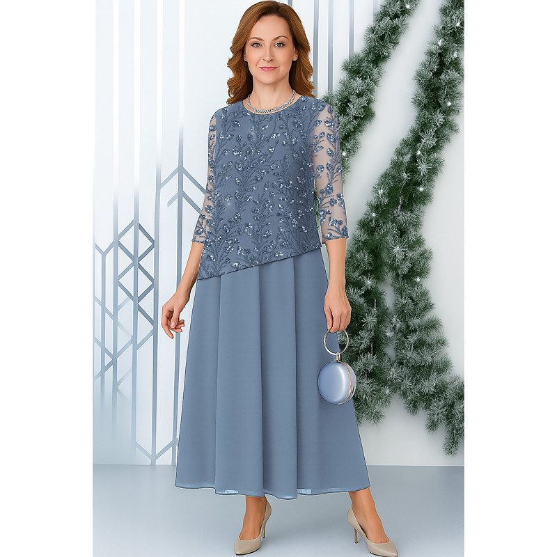 A-Line Ankle Length Party Dress Cocktail Dress Wedding Guest Dress Mother of the Bride Dress 3/4 Length Sleeve Jewel Neck Elegant Wedding Guest Chiffon Lace with Sequin Ruching
