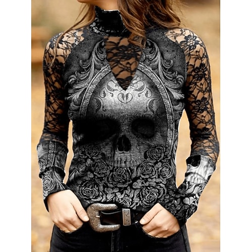 Blusa Donna Vintage Rock Hippie Manica Lunga Collo Alto Maglie Regolari Quotidiane Stampa Nera Verde Primavera Autunno Inverno