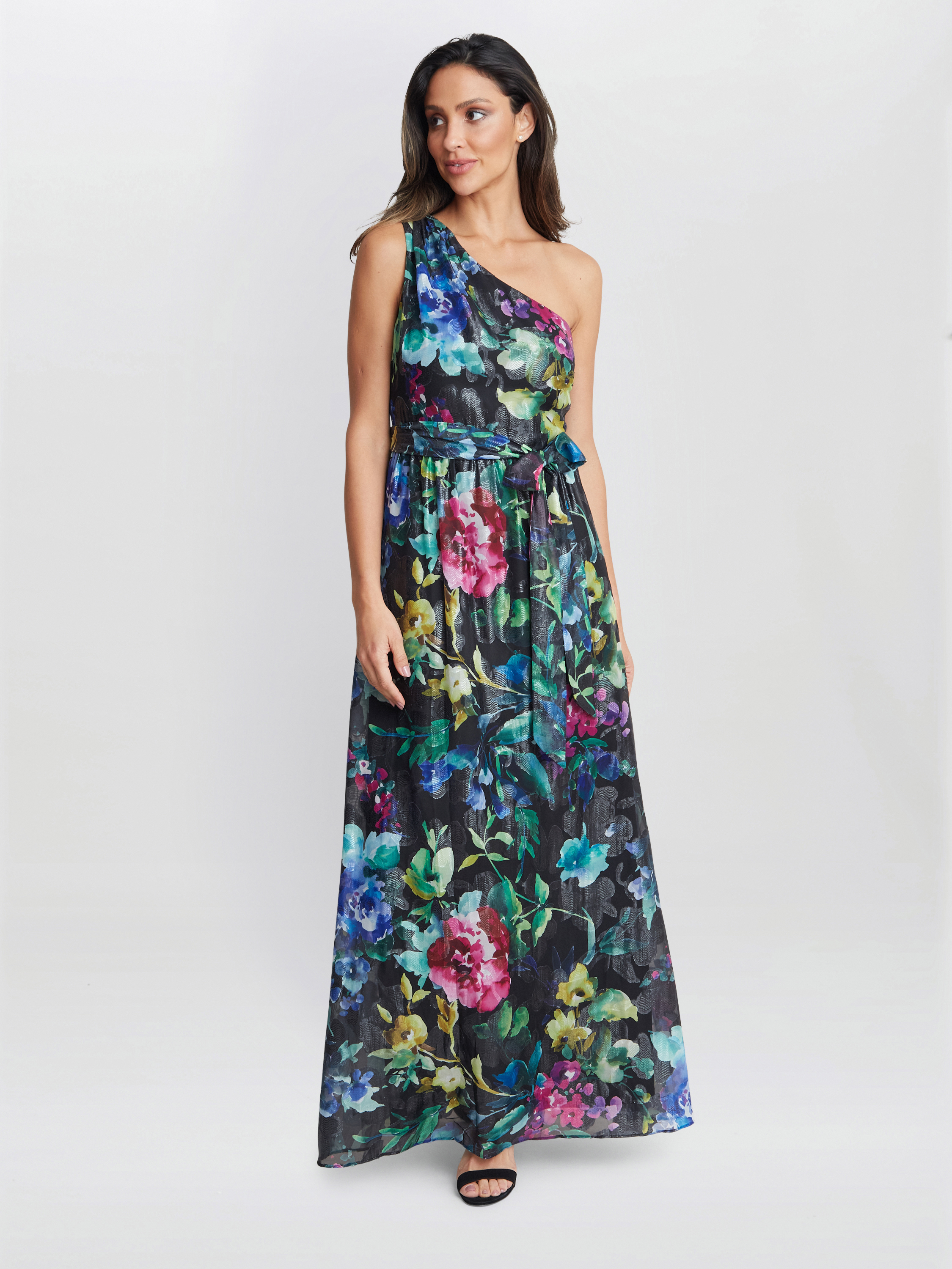 Gina Bacconi Womens Rosie Printed One Shoulder Maxi With Tie Waist - Black - Size 12 UK | Gina Bacconi Sale | Discount Designer Brands