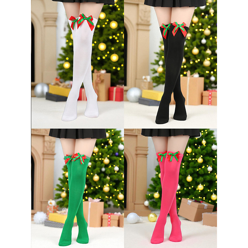 Women's Christmas Thigh High Socks Set, 4-Pair Striped Solid Red Holiday Stockings with Bows and Pom Poms, Festive Over-the-Knee Socks for Winter Parties Gifts