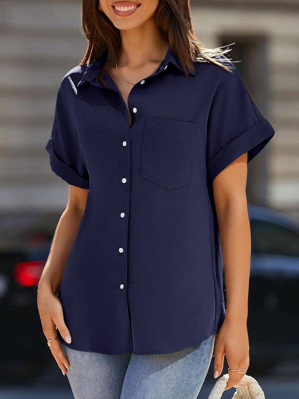 Women's Short Sleeve Shirts V Neck Collared Button Down Shirt Tops with Pockets (darkblue, XL)