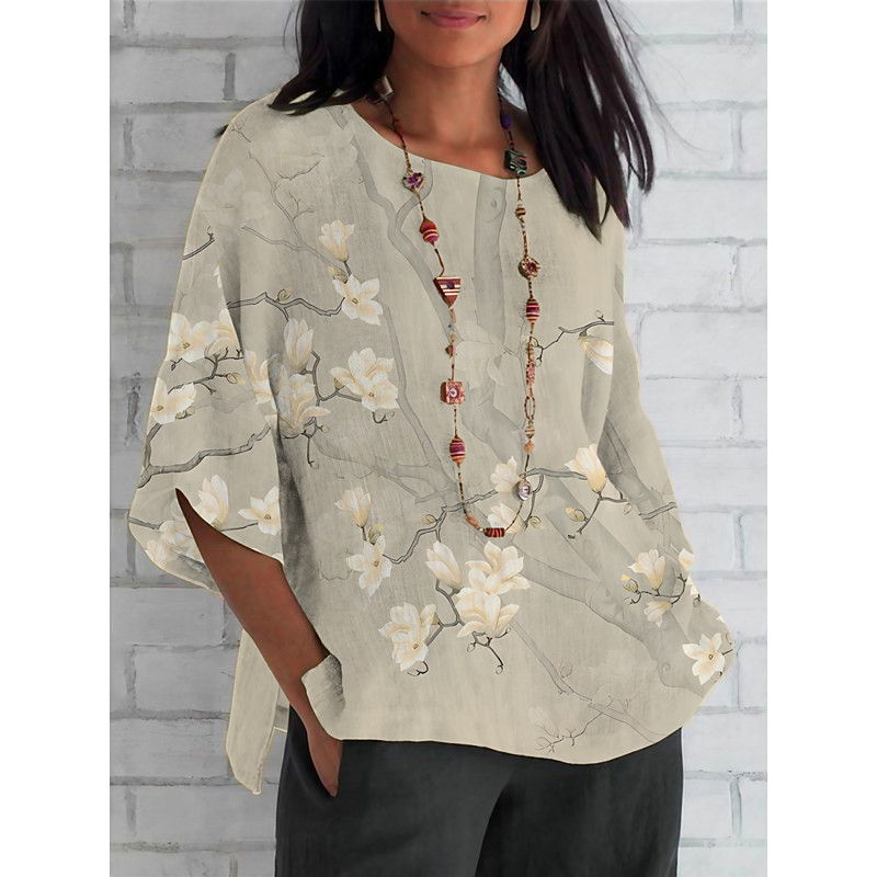 Women's Shirt Floral Daily Casual 3/4 Length Sleeve Crew Neck Regular Tops Daily Holiday Print Beige Gray Summer Spring Fall