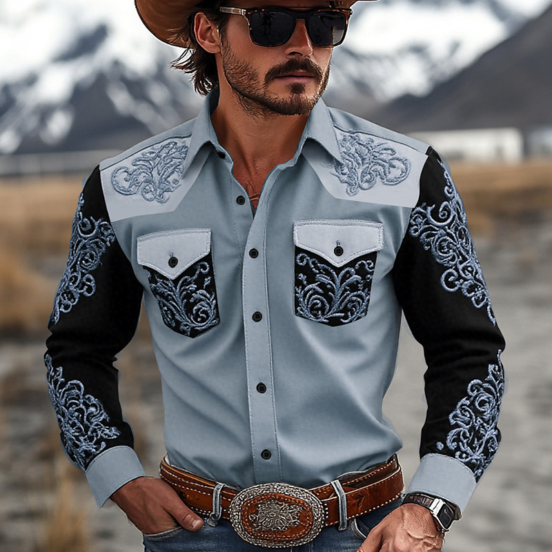 Men's Floral Print Ethnic Flowers Shirt Western Shirt Cowboy Shirt Long Sleeve Vintage Retro Outdoor Daily WorkWear Fall Winter Turndown 3D Print Front Two Pockets Button Up Shirts Blue Orange Khaki