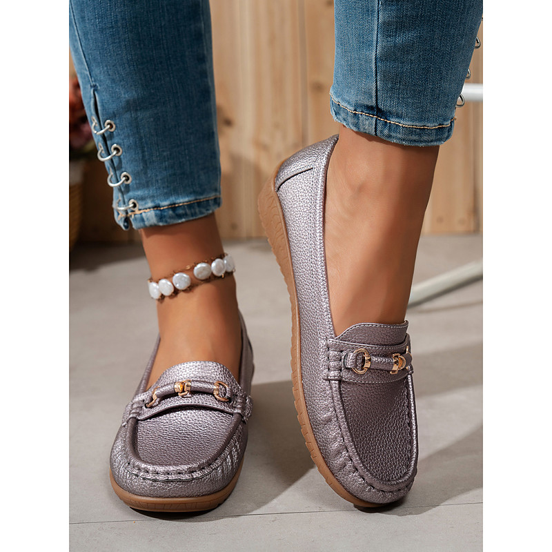 Women's Metallic Faux Leather Moccasin Loafers with Gold Horsebit Detail, Slip-On Comfort Flats for Driving, Work and Casual Outings