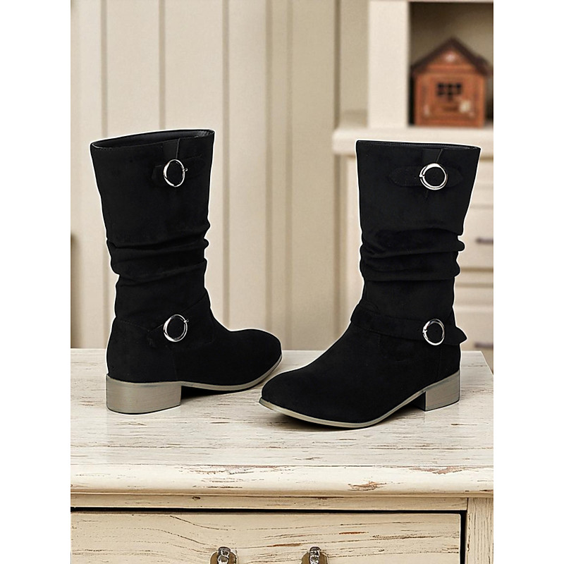 Women's Mid Calf Slouchy Boots with Buckle Straps – Vintage Suede Style Winter Boots for Casual Outfits and Autumn Fashion