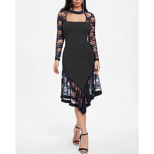 Per donna Abito Midi Abito nero Abito in Pizzo Abito da Ballo Vestito da Festa Elegante Moda Moderno Festa serale Feste Occasione speciale Vestibilità regolare Semplice Manica Lunga Girocollo Blu