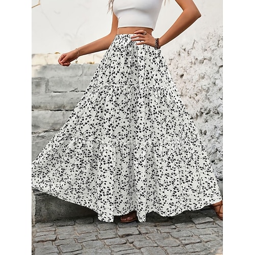 Per donna Gonna da vacanza Moda Casual Maxi Vita Alta Gonne Floreale Arricciato Stampato Micro-elastico Quotidiano Streetwear Blu Nero Bianco Estate Poliestere
