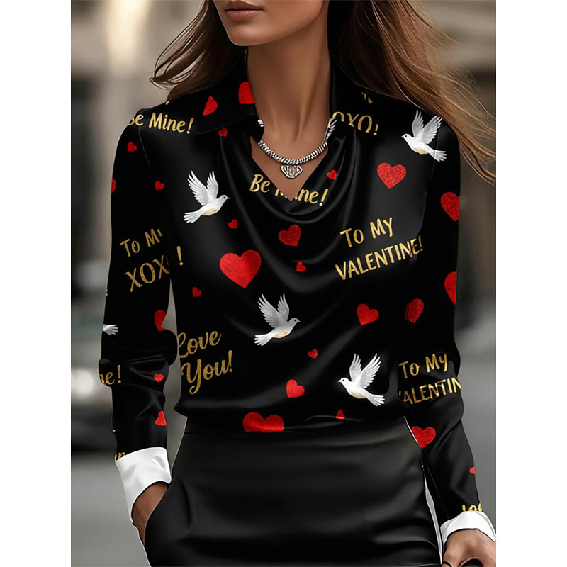 Valentine's Day Women's Shirt Heart LOVE Elegant Stylish Casual Long Sleeve Cowl Neck Regular Tops Work Daily Holiday Print Draped Black Spring