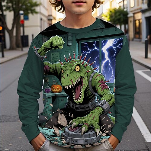 Halloween Jungen 3D Kürbis Dinosaurier T-Shirt Langarm Frühling Herbst Mode Basic Kinder 4-12 Jahre Rundhalsausschnitt Outdoor Lässig Täglich Normale Passform