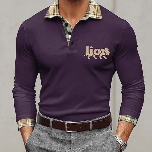 Herren Löwe Polo Langarm Polo-Shirts Revers Business-Casual Outdoor Straße Athleisure Alltagskleidung 3D-Druck Knöpfe Frühling Herbst Blau Rote Purpur