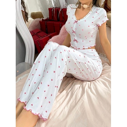 Per donna Set Pigiama Casual Comfort Cuore Elastico in vita Maglietta Pantalone Quotidiano Casa Manica Corta Scollo a V Blu Nero Rosa Rosso Estate Primavera Vestibilità regolare