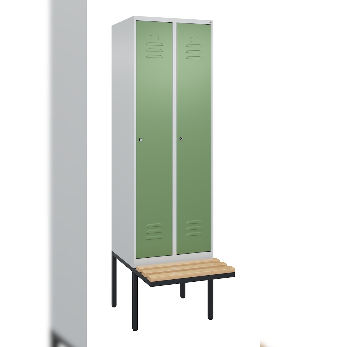 C+P Spind Classic PLUS, schwebender Sitzbank aus Buche 2 Abteile, HxBxT 212x60x82cm, Zylinderschloss, Hellgrau/Resedagrün von PROREGAL