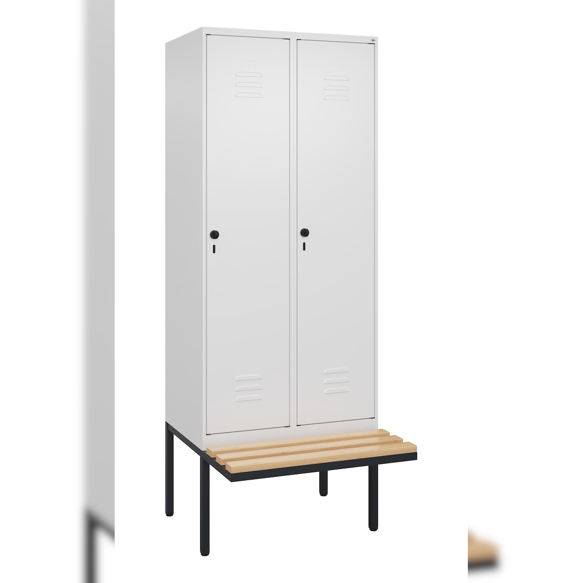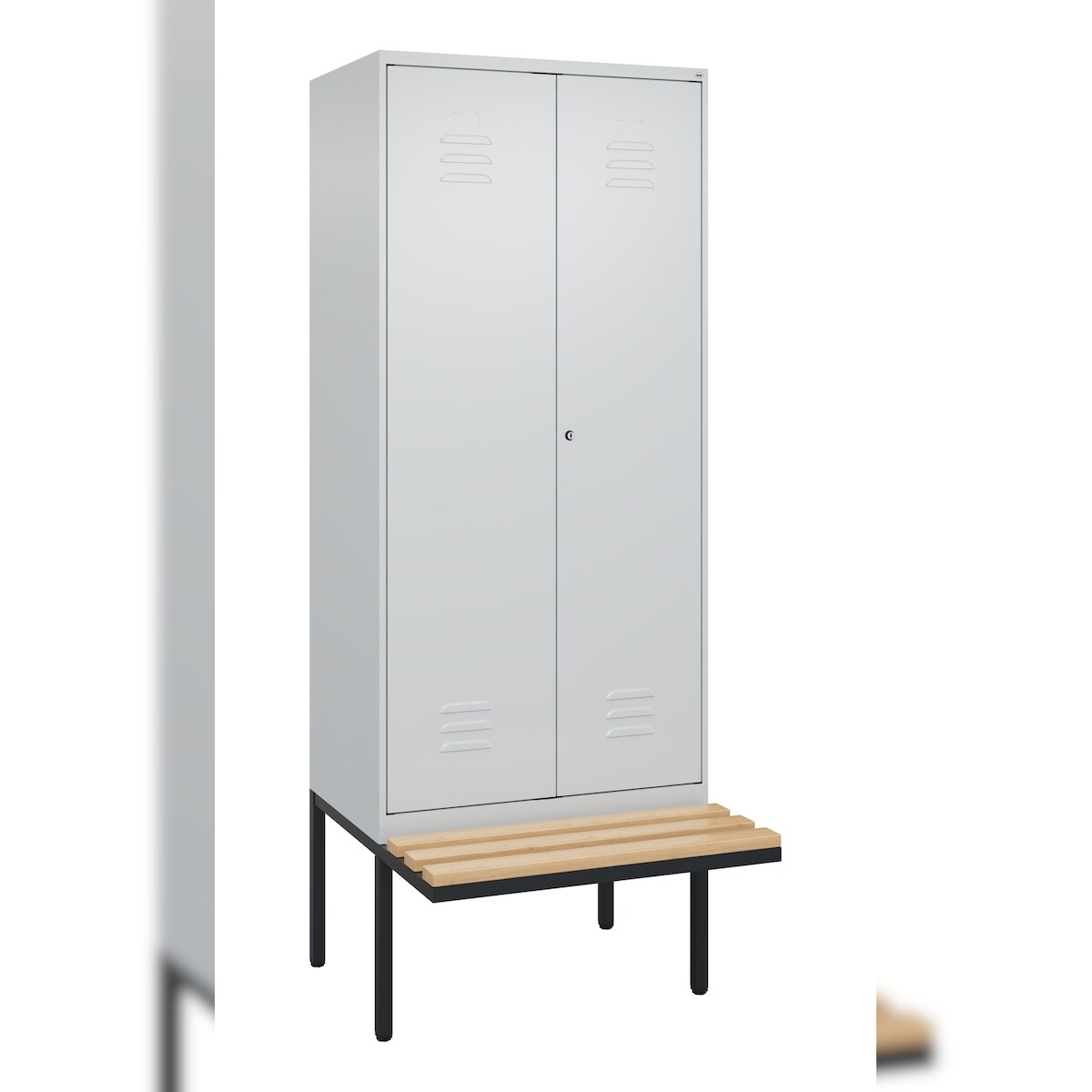 C+P Spind Classic PLUS, schwebender Sitzbank aus Buche 2 Abteile, HxBxT 212x80x82cm, Sicherheitsdrehriegel, Verkehrsweiß von PROREGAL