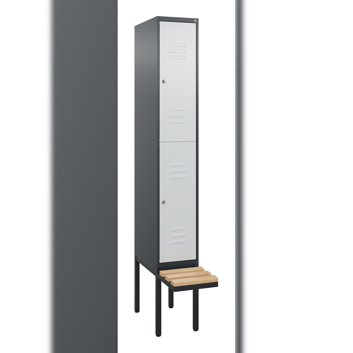 C+P Spind Classic PLUS, Buche schwebende Sitzbank, 2 Abteile, HxBxT 212x30x82cm, Zylinderschloss, Anthrazit/Hellgrau von PROREGAL