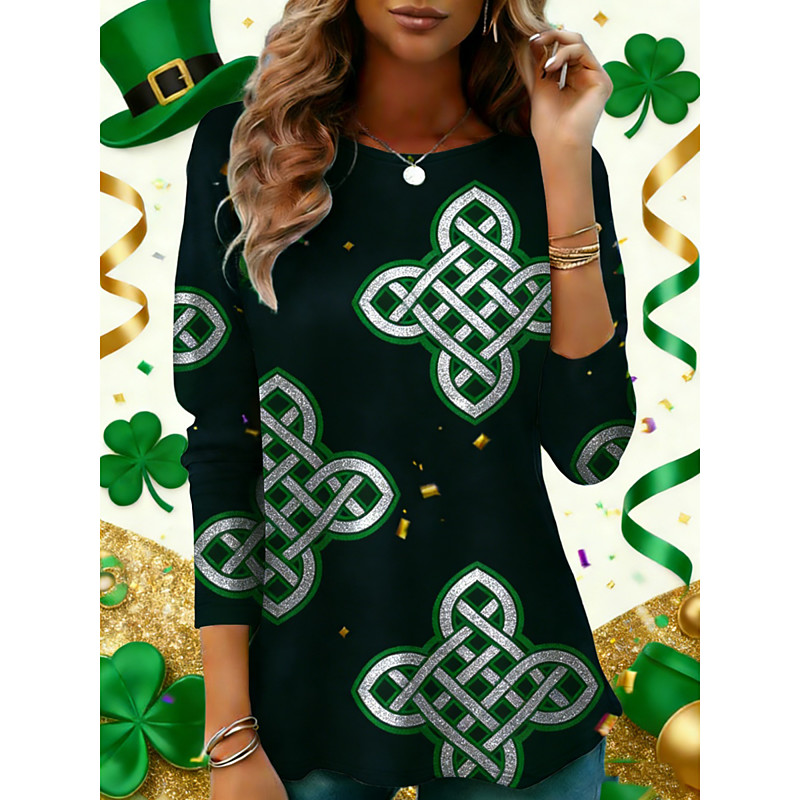 St. Patrick's Day Women's T Shirt Tee Top Graphic Geometric Fashion Stylish Classic Long Sleeve Crew Neck Regular Tops Daily Weekend Vacation Wear Print Dark Green Summer Fall