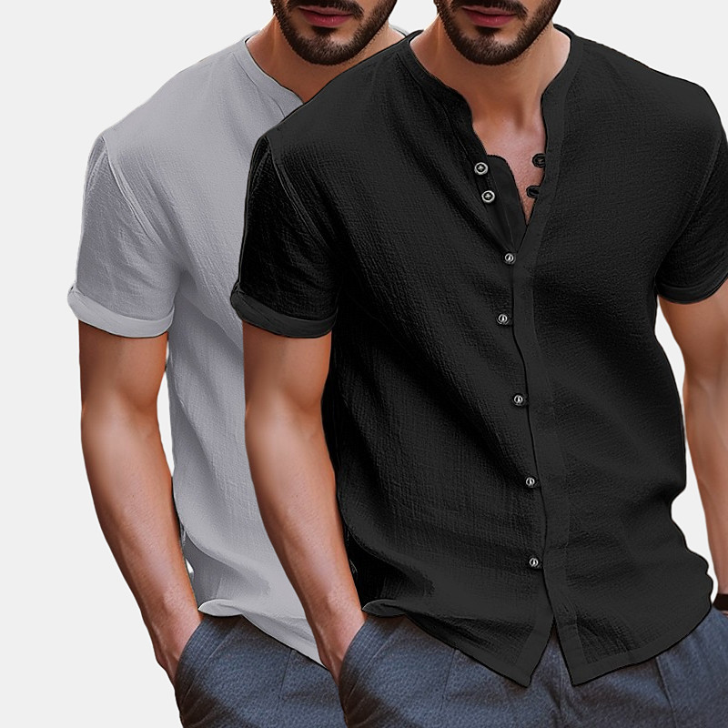 Men's Shirt Linen Shirt Summer Shirt Beach Wear Band Collar Shirt Button Up Shirt Plain Vacation Casual WhiteKhaki BlueKhaki GrayKhaki WhiteBlack Short Sleeve Band Collar Summer Clothing Apparel
