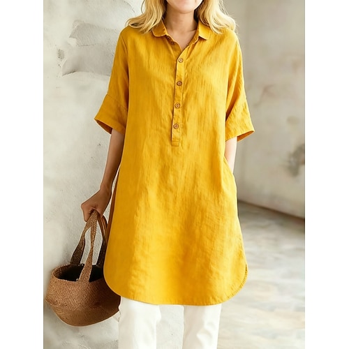 Per donna Abito Midi Finto cotone e lino Abito a Tubino Casual Quotidiano Vestibilità comoda Semplice Mezza Manica Bavero Giallo Rosso Viola Verde Estate Primavera Autunno