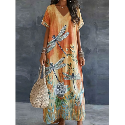 Per donna Abito maxi Vestito Casual Elegante Bohemien Vintage Vestibilità comoda Floreale Grafico Manica Corta Scollo a V Blu Rosa Viola Arancione Estate Primavera