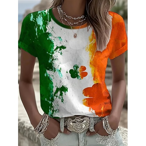 T-shirt da donna per il giorno di San Patrizio floreale alla moda classica casual maniche corte collo tondo tops regolari per uscite quotidiane stampa verde estate primavera
