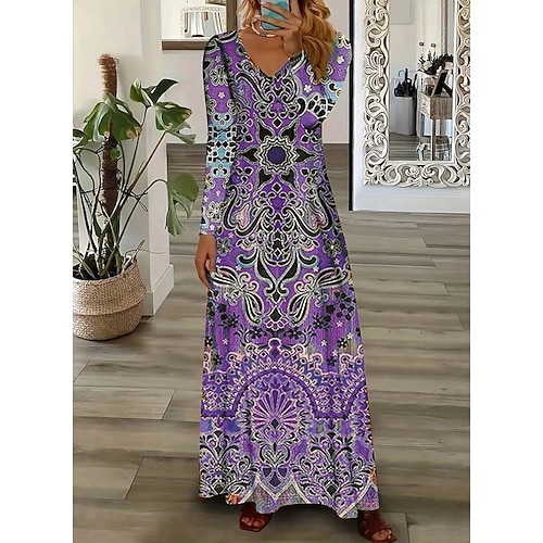 Per donna Abito maxi Tubino Festa Casual Boho Quotidiano Data Uscire Vestibilità regolare Grafico Paisley Manica Lunga Scollo a V Rosa Viola Arancione Verde Primavera Autunno Inverno