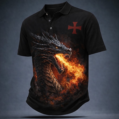 Herren Drache Kreuz Poloshirts Kurzarm Polo-Shirts Revers Vintage Lässig Straße Athleisure Alltagskleidung 3D-Druck Knöpfe Atmungsaktives Gewebe Sommer Frühling Schwarz Rote Braun