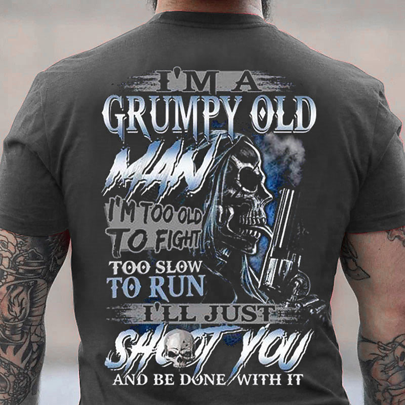 Mens Grumpy Old Man T-Shirt - Funny Graphic Tee with Skull Gun Design 'I'll Just Shoot You' Dark Humor Lifestyle