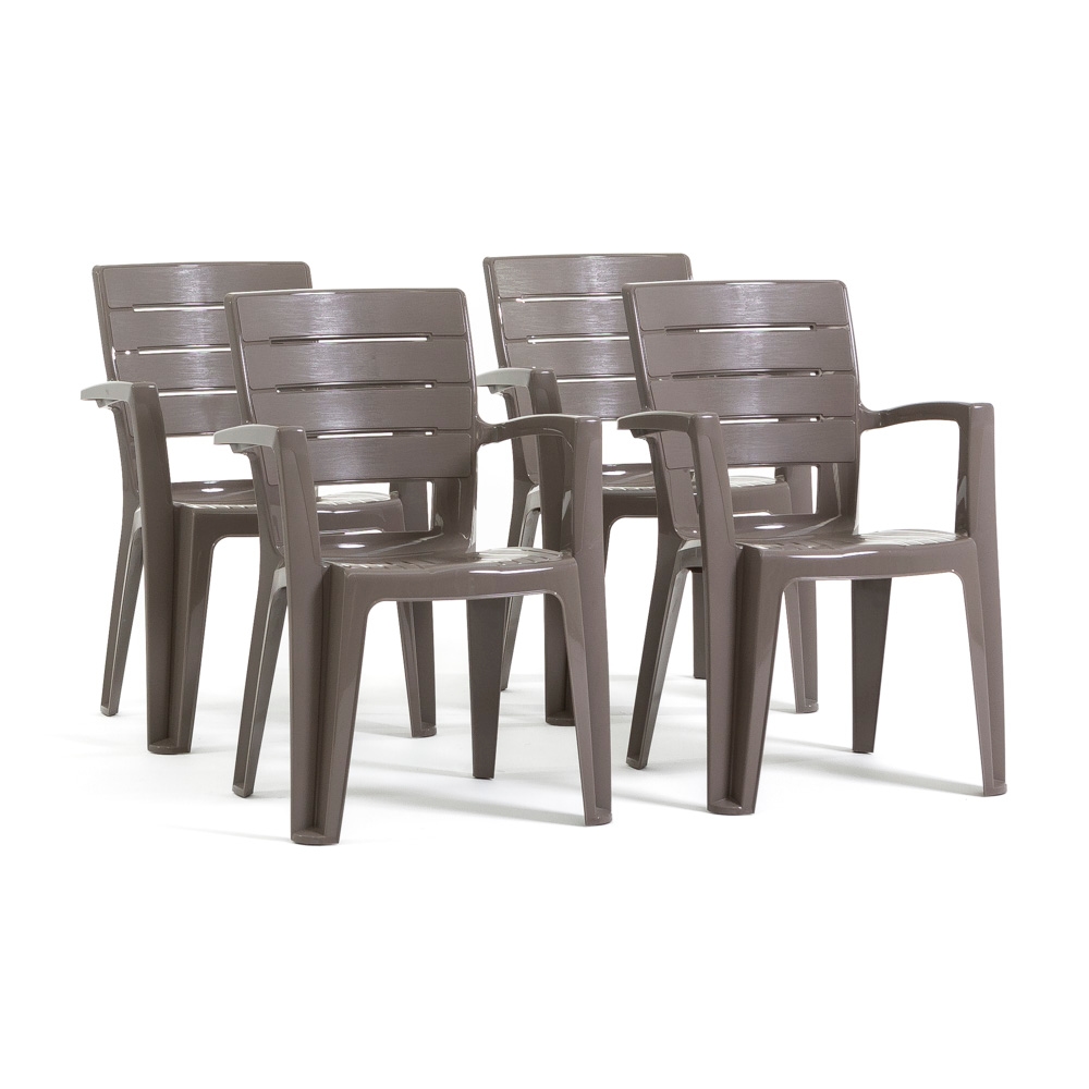 RATTATAN Set aus 4 einteiligen Stühlen aus Polypropylen mit Glasfaser, Holzoptik, stapelbar für Außen- und Gartenbereich, Bar und Restaurant – Anita – Taupe
