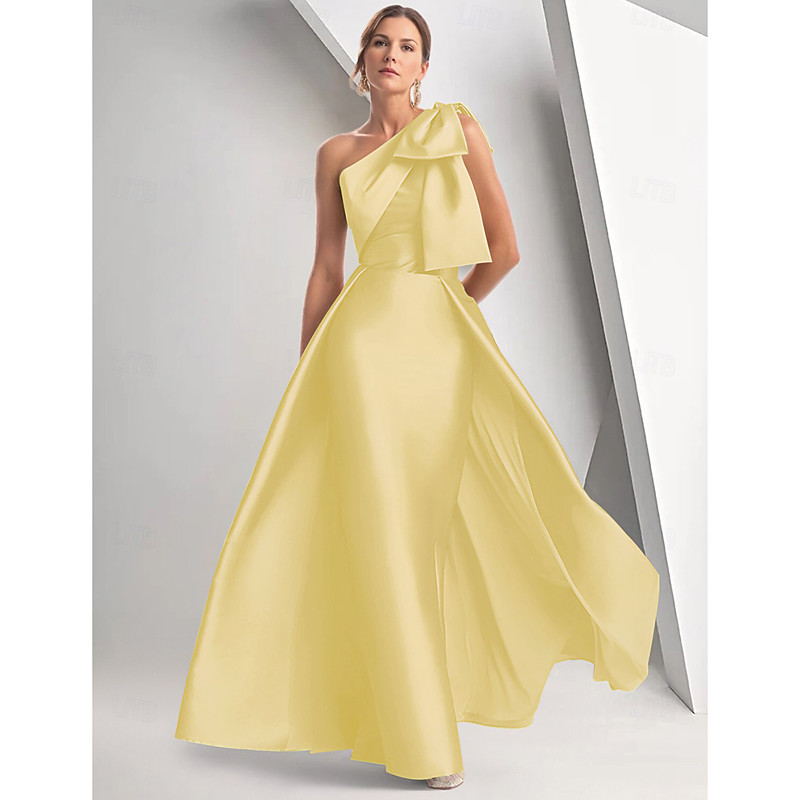 A-Line Floor Length Evening Gown Ball Gown with Overskirt Formal Dress Elegant Sleeveless One Shoulder Christmas Formal Fall Wedding Guest Satin with Bow(s)