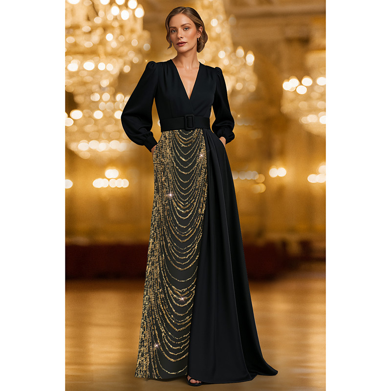 A-Line Floor Length Evening Gown Ball Gown Elegant Glittering Sparkle Long Sleeve V Neck Wedding Formal Pocket Sequined with Glitter