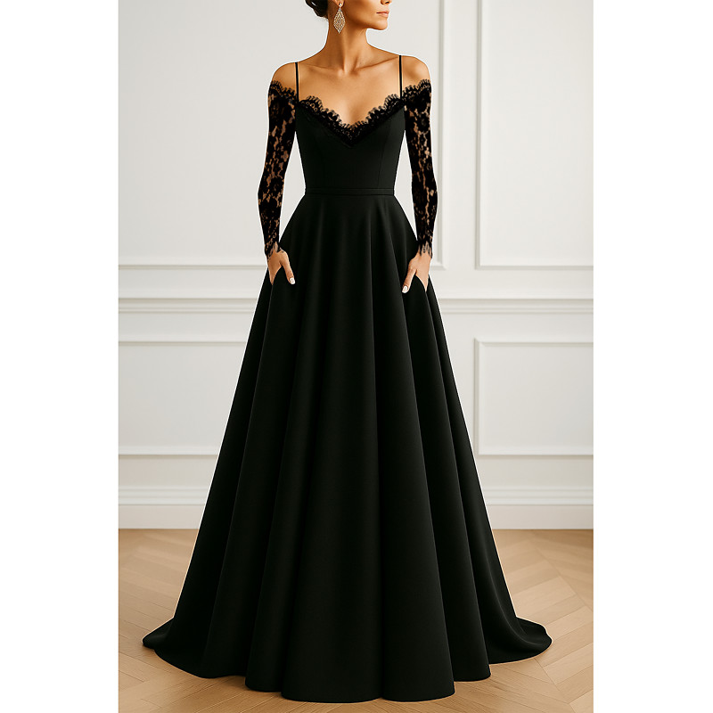 A-Line Floor Length Evening Gown Ball Gown Formal Dress Elegant Black Dress Silky Long Sleeve Off Shoulder Wedding Formal Capes Satin Lace with Pocket