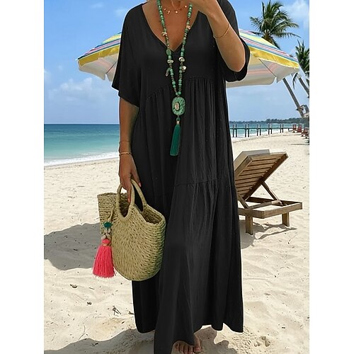 Per donna Abito maxi Finto cotone e lino Abito a Tubino Casual Quotidiano Spiaggia Vestibilità comoda Semplice Manica Corta Scollo a V Nero Beige Estate Primavera