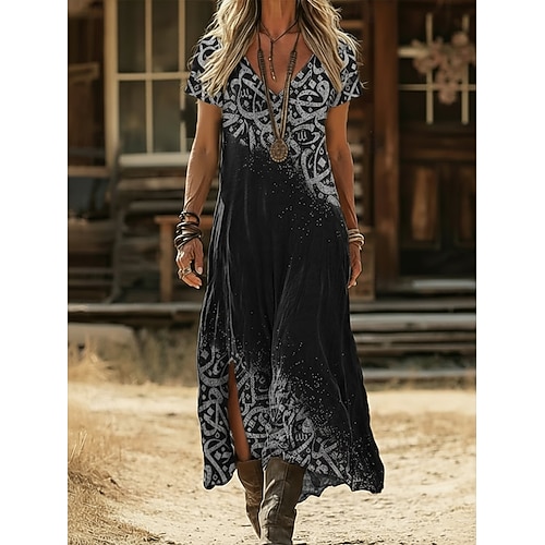 Per donna Abito lungo maxi Abito Boho Vestito Casual Abito a trapezio Abito Stampato Vintage All'aperto Vacanza Weekend Vestibilità comoda Grafico Manica Corta Scollo a V Nero Giallo Verde chiaro Rosa