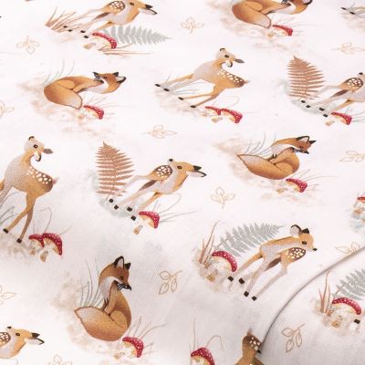 Tissu coton à impression numérique "chevreuil et renard", blanc/coloré, série "Sina"