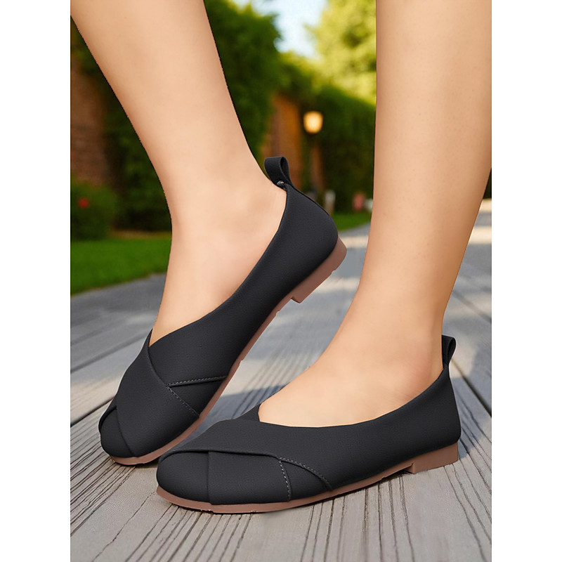 Women's Beige Cross Strap Wide Fit Flat Shoes – Soft Faux Leather Casual Slip-On Barefoot Flats for Office, Walking, Travel and Everyday Wear