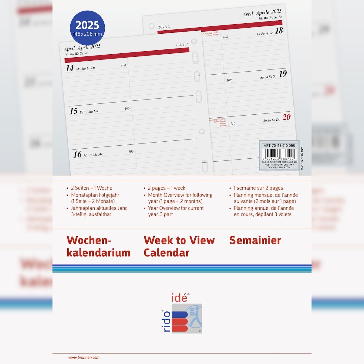 Rido Wochenkalendarium 1 Woche/2 Seiten 14,8x20,8cm A5 2025 Packung mit 3 Stück