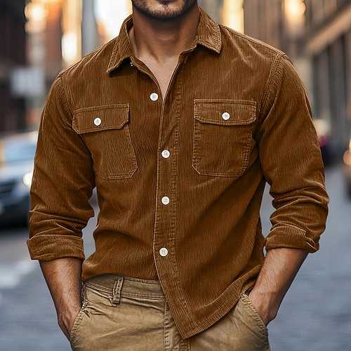 Per uomo Camicia di Velluto a Coste Nero Viola Marrone Grigio Manica Lunga Semplice Colletto Collo ripiegato Casuale All'aperto Tasca Abbigliamento Vintage Classico Casual