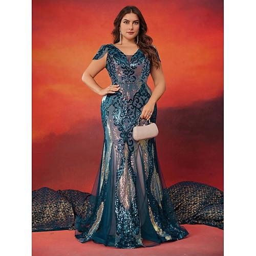 Abiti Quinceanera Sirena Tromba Abito Elegante Abito Formale fino al Pavimento Maniche Corte V Neck con Strass