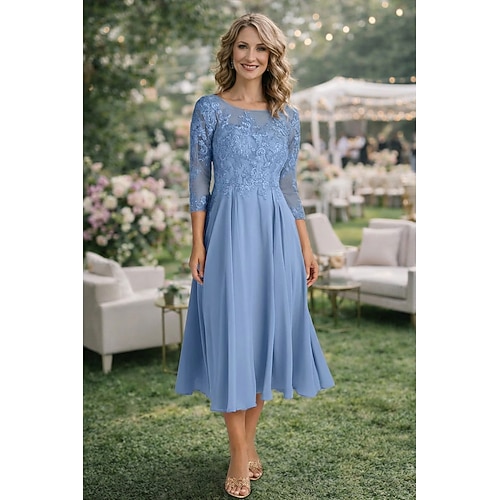 Linea ad A Lunghezza Tè Vestito da Festa Abito da Cocktail Abito da invitata a nozze Abito da cerimonia per signora Manica 3/4 Girocollo Elegante Ospite di nozze Festa di fidanzamento Chiffon Pizzo