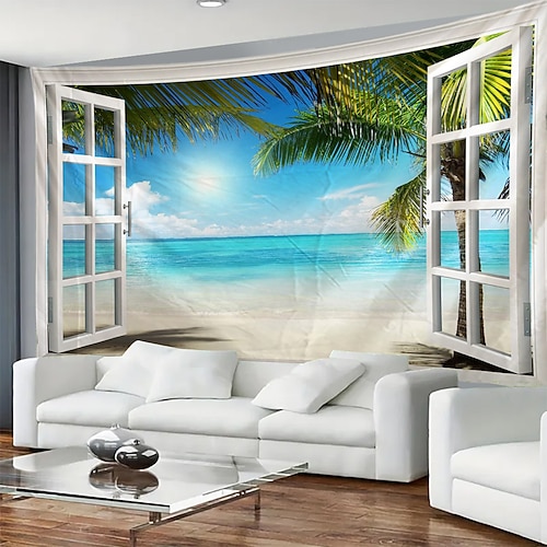 Arazzo da parete con vista sulla spiaggia in 3D, finta finestra, oceano, palme tropicali, paesaggio costiero, decorazione da parete per soggiorno, sala yoga