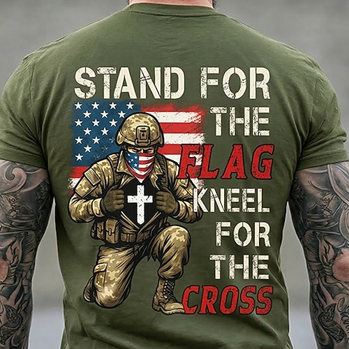 Amerikas 250. Jahrestag: T-Shirt für Männer mit dem Motiv „Steh für die Flagge, kniebe für das Kreuz", kniender Soldat, US-Flagge, patriotisch, christlich, Militärveteran, Grafik, lässige