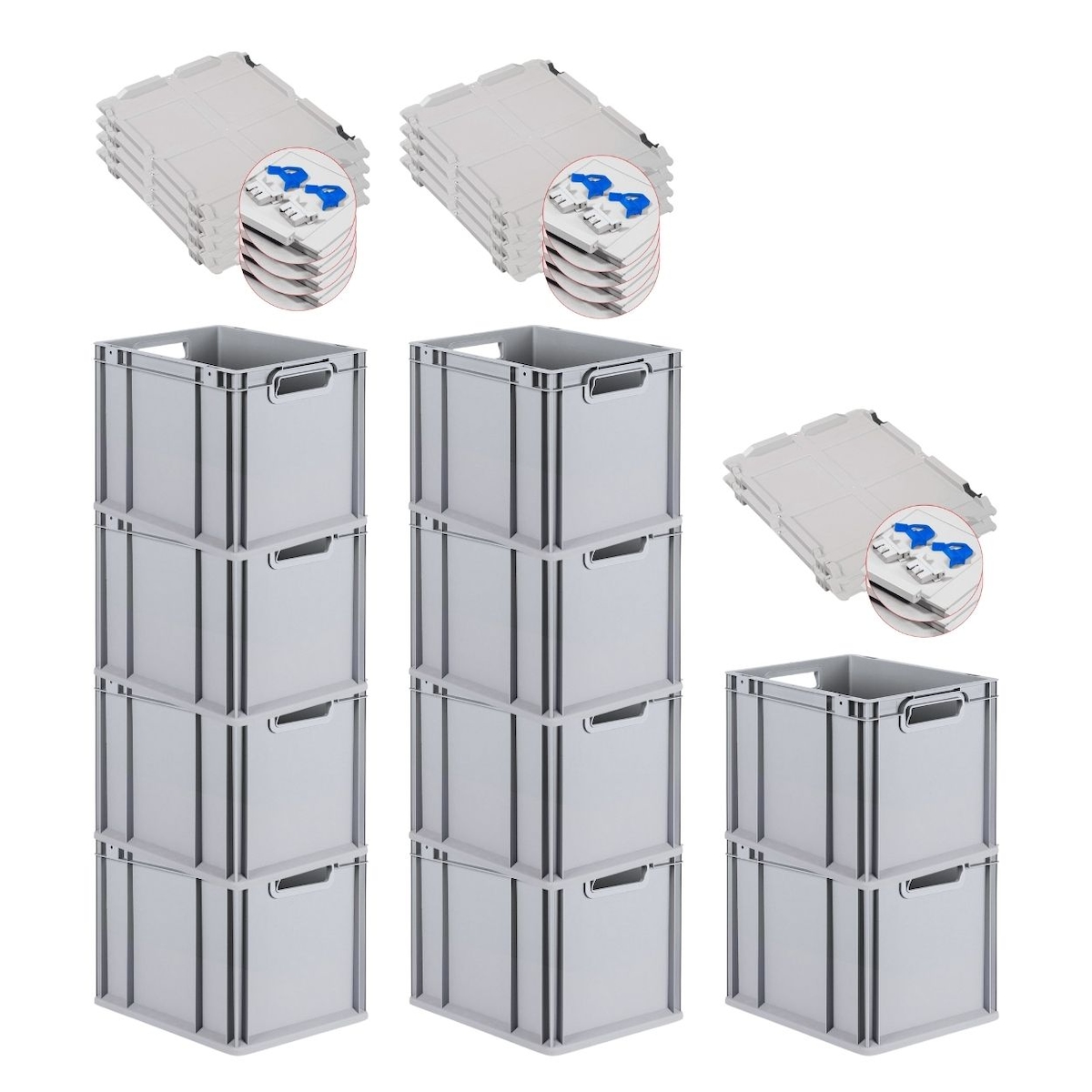 PROREGAL 10x Eurobox NextGen Grip mit Scharnierdeckel & blauen Verschlüssen | HxBxT 32x30x40cm | 30 Liter | Griffe offen | Glatter Boden