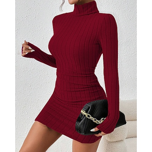 Per donna Abito Midi Abito in maglia Attillato Tubino Moda Moderno Vacanza Quotidiano Weekend Vestibilità regolare Semplice Manica Lunga Dolcevita Nero Vino Primavera Autunno