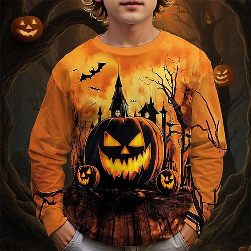 Halloween Jungen 3D Kürbis T-Shirt Langarm Frühling Herbst Mode Basic Kinder 4-12 Jahre Rundhalsausschnitt Outdoor Lässig Täglich Normale Passform