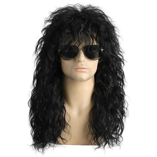 parrucca da uomo anni '80, parrucca lunga nera riccia stile mullet, costume da uomo rocker heavy metal per feste in maschera e cosplay