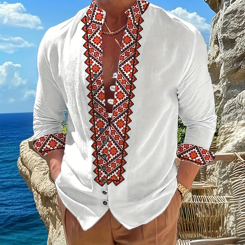 Men's Geometric Ethnic Indian Culture Shirt Stand Collar Shirt Long Sleeve Vintage Retro Vacation Daily Wear Going out Spring Fall Mandarin Collar Band Collar Button-Down Linen Like Shirt White 1