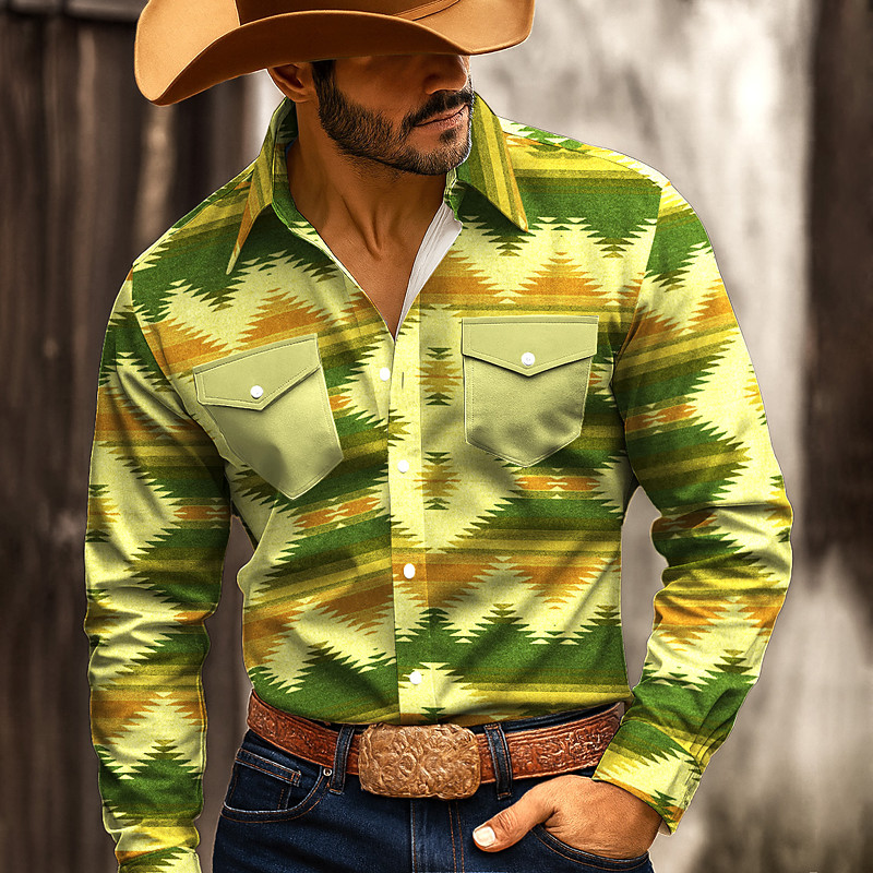 Men's Geometric Pattern Ethnic Shirt Western Shirt Cowboy Shirt Long Sleeve Vintage Retro Outdoor Casual WorkWear Spring Fall Turndown Front Two Pockets Linen Like Shirt Button Up Shirts Blue Green