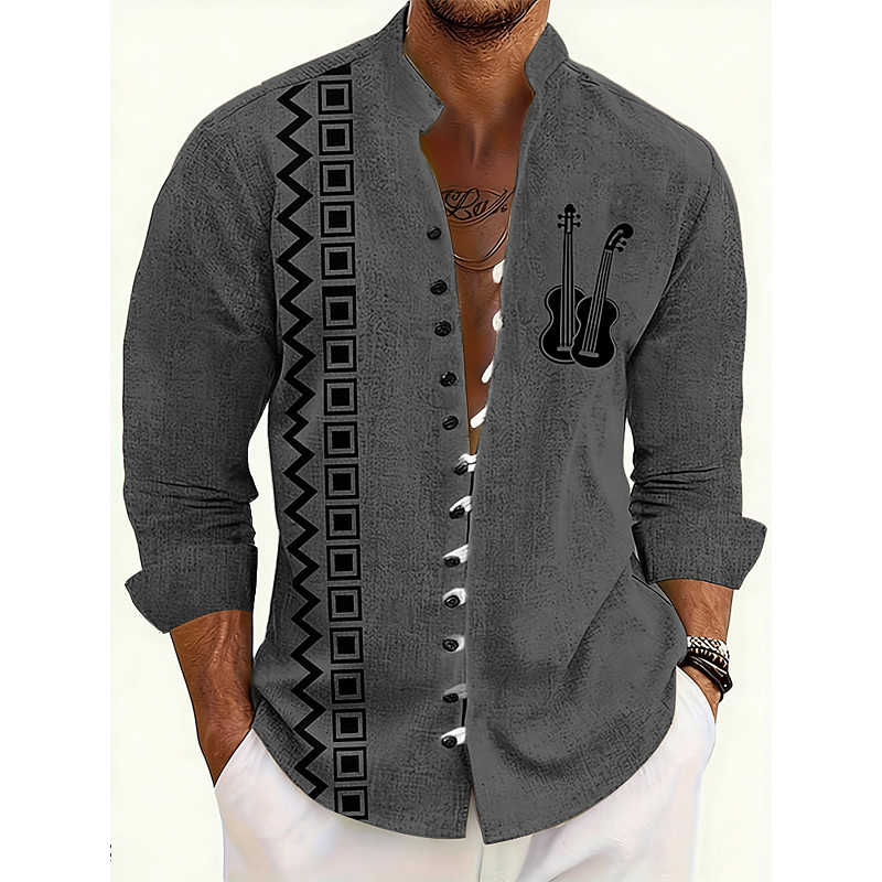 Men's Geometric Pattern Guitar Musical Instrument Shirt Stand Collar Shirt Long Sleeve Vintage Retro Casual Vacation Spring Fall Mandarin Collar Band Collar Button-Down Linen Like Shirt Blue Orange