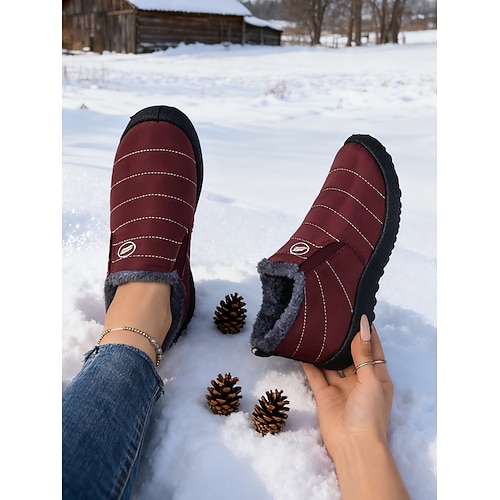 Sneakers invernali da donna in caldo pile foderate in bordeaux - comode scarpe da esterno comode e impermeabili slip-on per il freddo e i viaggi di Natale