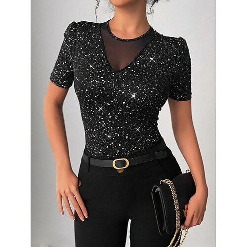 Per donna Maglietta Moda Caldo Sexy Manica Corta Girocollo Top Regolari Uscire Weekend Abiti da festa Paillettes Rete Nero Estate Primavera