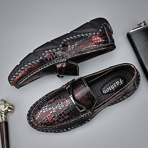 Mocassini da uomo con motivo coccodrillo rosso e nero: eleganti scarpe slip-on con nappe per abbigliamento formale e casual